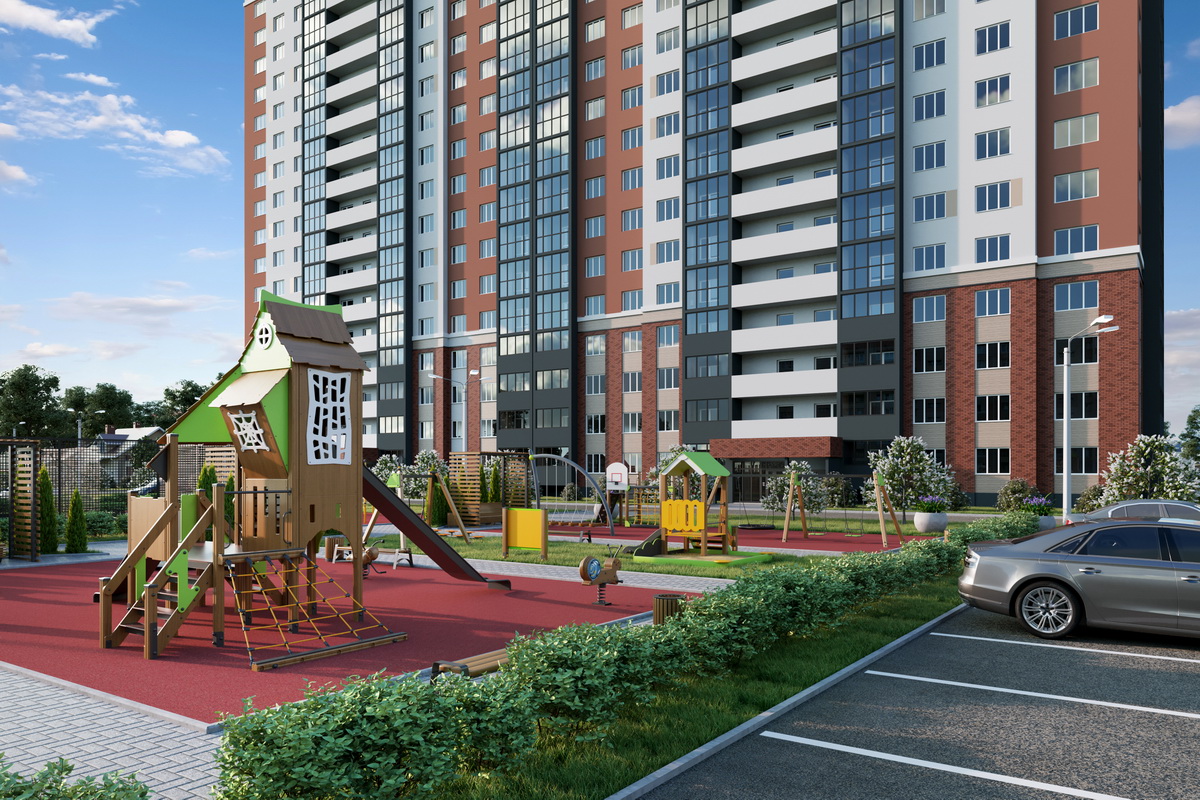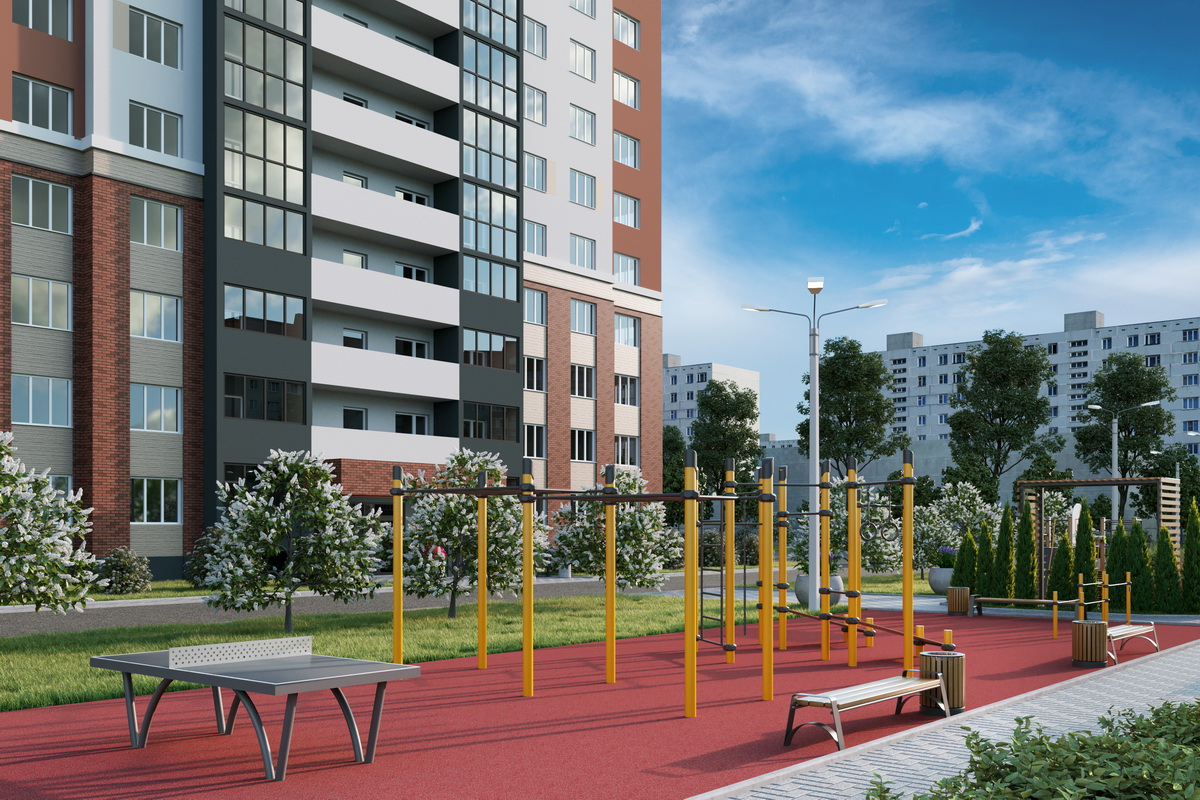 - Досуговую территорию мы разделили на 6 функциональных зон: огороженная спортивная площадка для стритбола с резиновым покрытием, спортивная зона для воркаута с резиновым покрытием, детская игровая площадка в ЭКО стиле с резиновым покрытием, детская игровая площадка с газоном для игры в песок, детская спортивная площадка с резиновым безопасным покрытием и мини-сквер с удобными парковыми диванами, окруженными зелеными туями.
