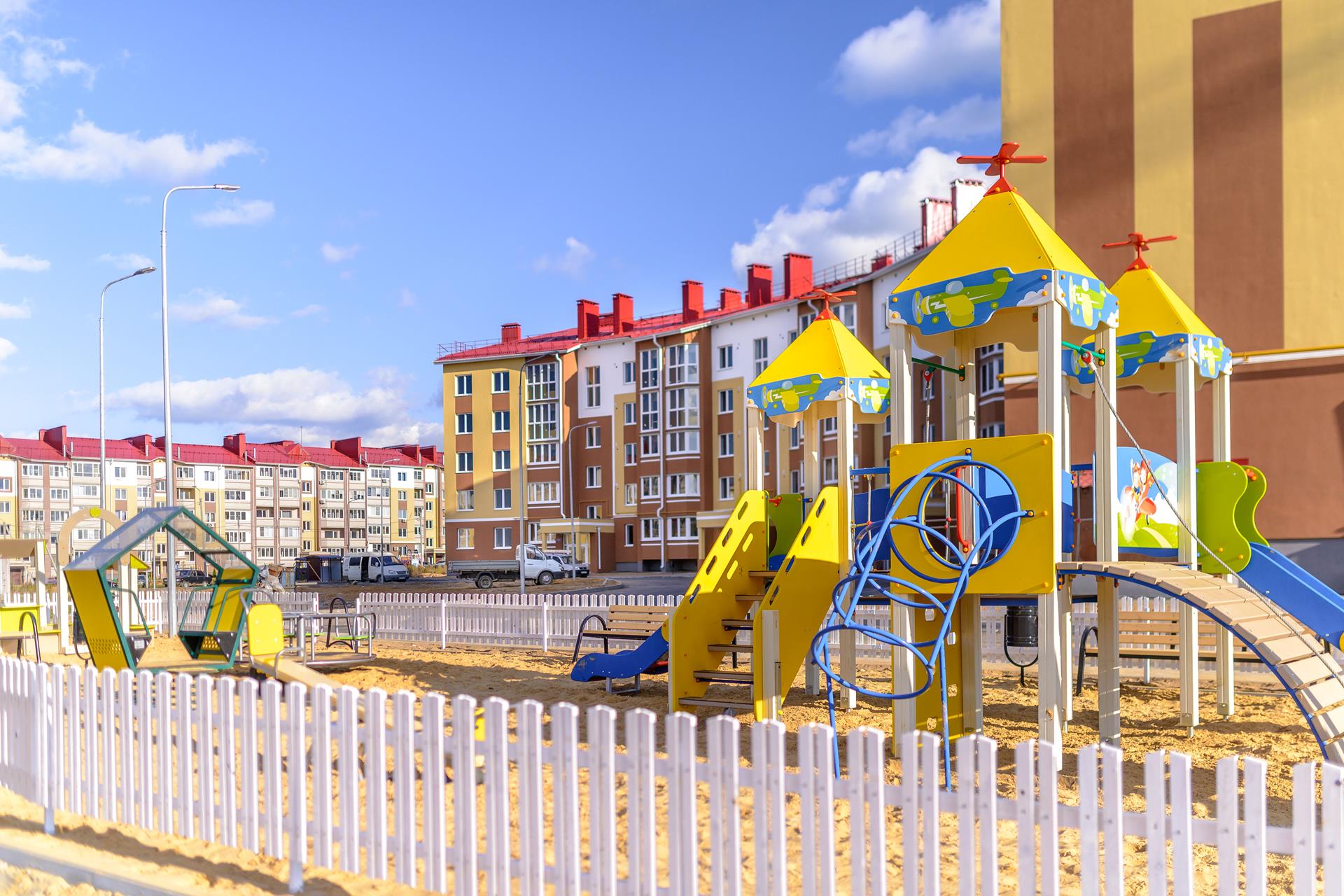 Рядом с домом расположена уютная детская площадка с резиновым покрытием, интересными игровыми комплексами и удобными скамейками для родителей. А для прогулок с коляской или семейных променадов прекрасно подойдут площадь и пешеходная аллея, расположенные прямо перед домом.