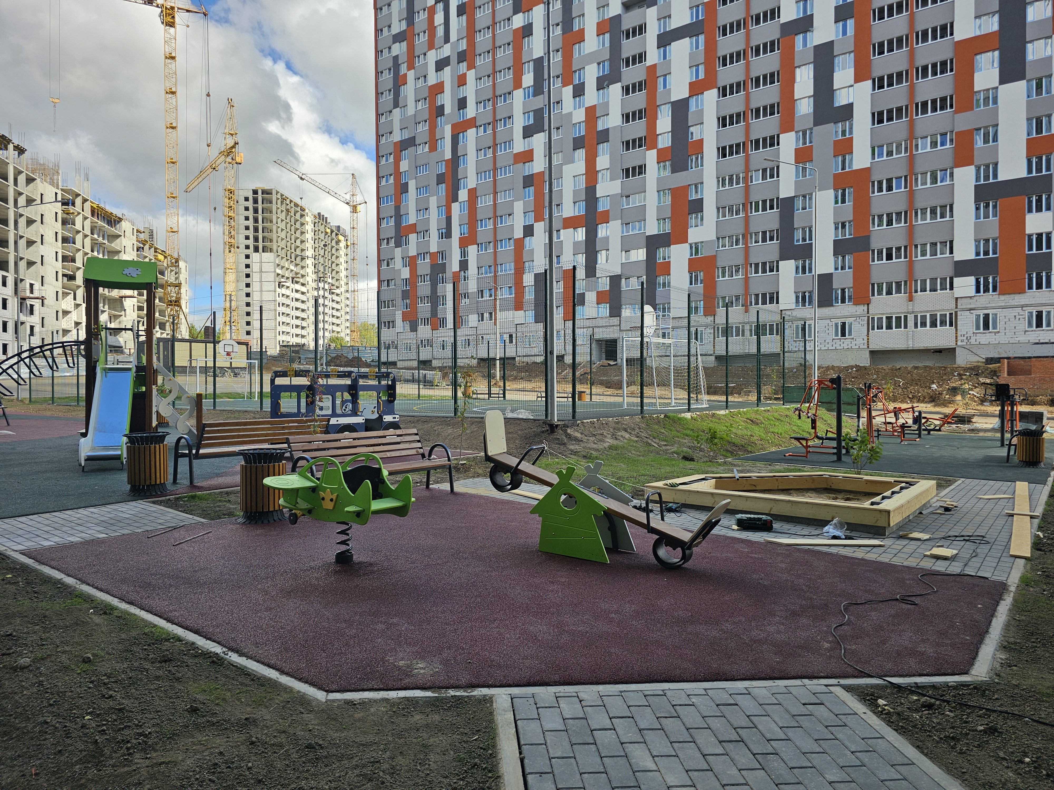 Особое внимание — комфорту и безопасности будущих жителей. Детские и спортивные площадки оснащены современным резиновым покрытием — мягким, износостойким и абсолютно безопасным. Всё оборудование установлено, зоны оформлены с заботой о каждом возрасте — от малышей до взрослых. Они уже ждут своих первых героев!